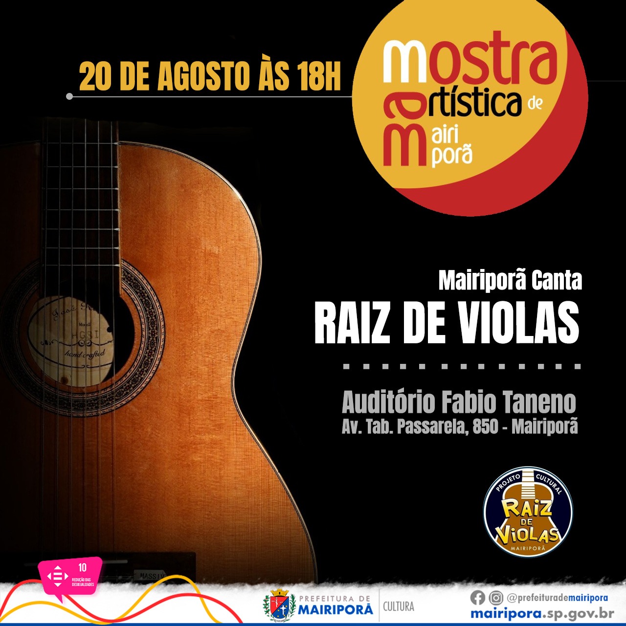 Neste sábado, dia 20 de agosto, receberemos no projeto MAM – Mostra Artística de Mairiporã – o coletivo municipal, RAÍZES DE VIOLAS. O grupo trabalha pelo resgate e valorização da música caipira paulista e neste ano recebeu o prêmio Inezita Barroso, importante reconhecimento oferecido pela Assembleia Legislativa do Estado de São Paulo, a iniciativas que se destacam no campo do resgate das tradições caipiras do Estado de São Paulo, com foco nas tradições musicais.